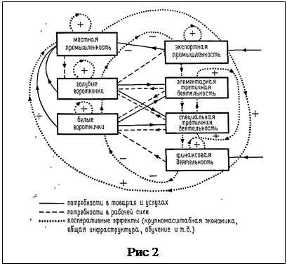 Пригожин рассмотривает развитие городского центра, в котором определенные территории специализируются на конкретной экономической деятельности и где соседние районы различаются не только по жизненным условиям, но и по доступности рабочих мест и различных видов услуг. Выделяются две основные группы населения, состоящие из трудящихся типа так называемых синих и белых воротничков. Что касается рабочих мест, то они могут относиться к производству товаров для местного потребления или на экспорт, к так называемым третичным функциям (основные и специальные виды обслуживания населения), а также к области финансовой деятельности. Основными переменными, определяющими состояние системы, являются количества представителей k-й группы в точке i, обозначаемые X (k=1,2), а также соответствующие рабочие места jРазличные варианты выбора, предлагаемые каждому человеку, находятся в точках i, которые можно считать центрами некоторой решетки, представляющей имеющееся п нашем распоряжении пространство. Механизмы взаимодействия различных переменных суммированы на рис. 2. Подробно вывод нелинейных функций рассматривается в [3].