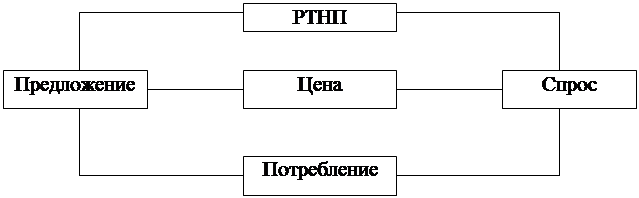 Рынок как экономическая категория товарного производства представляет собой сферу товарно-денежного обращения и охватывает совокупность конкретных отношений и связей между производителями и потребителями товаров. Формы рыночных отношений проявляются в количественных и качественных отношениях основных элементов рынка: спроса, предложения и цены. Под воздействием этих элементов формируются пропорции между производством и потреблением. Взаимосвязь элементов рынка товаров народного потребления (РТНП).