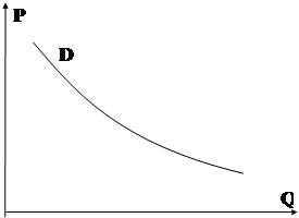 Измеряя спрос количеством товаров, которые покупатели готовы купить (Q), можно выразить зависимость спроса от цены (P) некоторой убывающей функцией Q=D(P) и наглядно представить закон спроса графически в виде так называемой кривой спроса: