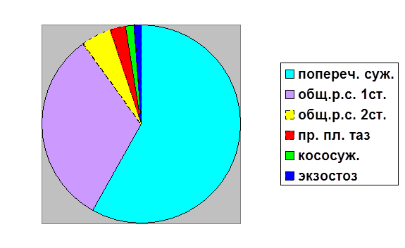 2. По классификации анатомически узкого таза на 1-м месте находится поперечносуженный таз – 58%, что совпадает с литературными данными – 45,2%. На 2-м месте по данным нашего анализа располагается общеравномерносуженный таз – 37%, по данным литературы – 8,5%. На 3-м месте по частоте встречаемости занимает по нашим данным простой плоский таз – 2,47%, по литературным данным – 13,6%.