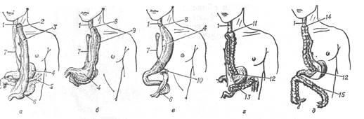 Удаление пораженного пищевода - весьма травматичная операция, чреватая тяжелыми осложнениями. Признано более целесообразным накладывать обходной искусственный пищевод. Для этого используют желудок, тонкую или толстую кишку (рис. 1).