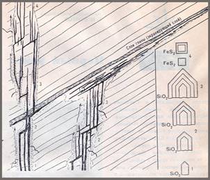 1, 2, 3, 4, - последовательные стадии роста минералов: кристаллов кварца и пирита. Рост кристаллов в недрах Земли оказывается связанным с 11-летним циклом солнечной активности.
