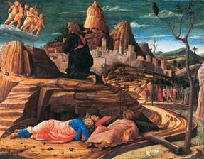 "Моление о чаше" Андреа Мантеньи обильно символами. Коленопреклонённый Спаситель молится на скале, которая символизирует мужество, силу, твёрдость в вере. Ведь, несмотря на проявление минутной слабости, Христос сказал Богу Отцу: "Не Моя воля, но Твоя да будет". С неба Ему являются ангелы. Один из них держит крест, как знак того, что именно на кресте будет распят Спаситель. В руках другого ангела — копьё, указывающее на то, что копьём будет пронзен распятый Христос. У третьего ангела — колонна, символ Страстей Господних. По скале от молящегося Богочеловека убегают кролики — символ робости и плотских похотей. Это означает, что в двойственной природе Христа (Бога и человека) побеждает духовное, Божеское начало. У подножия крепко спят трое Его любимых учеников. Сон — символ духовной смерти. Возле них три что-то грызущих кролика. Это указывает, что в учениках ещё много человеческих слабостей, которыми и объясняется их сон. На высоком полусухом дереве сидит пеликан — символ Бога Отца и жертвенной смерти Христа. Внизу, возле спящих учеников, мы видим птенцов пеликана. Согласно преданию, пеликан вскармливал своих мёртвых птенцов кровью, после чего они воскресали, а сам он умирал. Эта аллегория указывает на добровольную жертву Христа ради спасения человечества, ради нравственного воскресения людей. Поэтому Данте называл Его — nostro Pellicano (наш Пеликан). Скала, на которой находятся Христос и его ученики, отделена от остального мира руслом ручья, через который перекинут мосток. Мост, соединяющий два берега, символизирует переход из одного мира в другой: от мира смертных и смерти к миру вечной жизни, бессмертия. На бесплодной скале рядом с учениками видны ростки новой жизни: растёт молодое деревце и местами пробивается травка сквозь камни. Этим художник выразил мысль, что новое христианское учение уже дало ростки в душах учеников и обещает их преображение в апостолов, проповедников новой веры.
