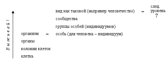 Примечание. Уровни обобщения, приведенные на рисунке (клетка, колонии клеток и т.д.), в целом воспроизводят динамики, о которых шла речь на три абзаца выше, – сравните.