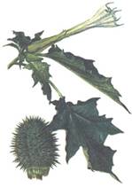 Описание растения. Дурман обыкновенный — однолетнее, неприятно пахнущее растение семейства пасленовых, с прямостоячим, гладким, в верхней половине ветвистым стеблем, достигающим в высоту 40—100 см. Листья яйцевидные с заостренной верхушкой и острыми лопастями длиной 7—20 см, снизу бледные, сверху зеленые. Цветки крупные, длиной 7— 12 см, помещаются поодиночке в разветвлениях стебля и его ветвей на прямых, торчащих вверх пушистых цветоножках, венчик белый. Плод—яйцевидная, прямостоячая коробочка, покрытая твердыми шипами.