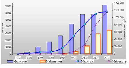 Помимо всего этого компания уделяет большое внимание на рекламу(46663 млн. руб. в 2002 г. по отношению 12860 млн.руб в 2001 г), что обеспечивает продвижению товара и новинок на рынок потребителя и стабильности брэндов, а также вытеснению конкурентной продукции(второе место на рынке масложировой продукции, общий доля продукции на рынке на 2004 г. 13%,). А также немаловажное место занимает постоянно растущий комплекс строительства, постоянно растущие инвестиции, которые способствуют расширению зоны действия торговых домов и расширение дистрибьюторской сети, что помогает продвижению товара в другие регионы и увеличивает потребительский спрос.