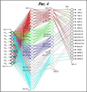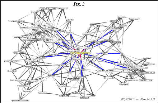 На рис. 3 изображена микро-структурная схема связей сайта NYTimes Online, выполненная программой 2002TouchGraph LLC37. Видно ее морфологическое подобие вычислительной нейросети, например, сконструированной на основе пакета “Нейроимитатор 4.3” 38 (рис. 4). В этом смысле сеть сайта в большей степени моделирует нервную ткань, в силу значительно более высокой информационной индивидуальности отдельных узлов связи в отличии от стандартизованных элементов сети “Нейроимитатора”, каждый однотипный формальный нейрон которого никак не отличается от другого.