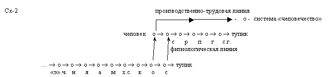 Вторичный процесс эволюции идет неотделимо от первичного и между ними нет видимой границы, но их необходимо различать, поскольку именно вторичный процесс создает главные условия для сформирования будущей системы “человечество” и именно благодаря ему весь процесс эволюции продолжится и после сформирования системы ближайшей цели эволюции. Дело здесь в том, что с началом вторичного процесса эволюции весь её ствол раздвоился на, как я их называю, физиологическую и производственно-трудовую ветви. “Физиологическая” – это первичный процесс эволюции (сх.1), а “производственно-трудовая” – это вторичный процесс эволюции (см. дальше схему-2). В основе первой лежит основообразующая пара функциональных элементов: “она – он”, а в основе второй - “потребитель-производитель” Первая заходит в тупик, поскольку мировоззренчески разделенные “соединения государств” не могут объединиться и образовать единую систему (об этом речь идет дальше). А вторая ведет весь эволюционный процесс к сформированию системы ближайшей цели – единой системе “человечество”.