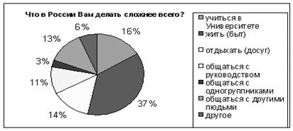 16% иностранных студентов отметили, что учеба в РУДН является для них самым трудным аспектом жизни в России. Распределение ответов на вопрос «Что бы Вы сделали, чтобы иностранным студентам было легче учиться?»: «увеличил бы количество часов изучения русского языка» – 25%; «создал бы условия для учебы в рамках общежития» – 42%; «купил бы в библиотеку РУДН учебники на своем родном языке» – 22%; «другое» - 7% и «ничего» – 4% - позволяет утверждать, что реально всего 4% иностранных студентов практически не испытывает трудностей в учебе.