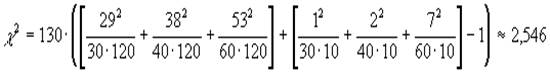 Вспомнив правило “трех s ” для c 2-закона, можно сказать, что при a =0,1 величина c 2Ј n + . Таким образом, при уровне значимости 10% (т.е. с риском ошибиться в 1 случае из 10) гипотеза о независимости признаков отвергается, если подсчитанное числоc 2> n + . В противном случае наблюдения не противоречат гипотезе о независимости.