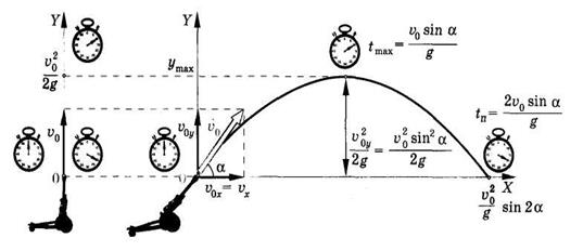 Определим основные параметры баллистического движения: время подъема на максимальную высоту, максимальную высоту, время и дальность полета. Вследствие независимости движений по координатным осям подъем снаряда по вертикали определяется только проекцией начальной скорости на ось Y. В соответствии с формулой: , полученной для тела, брошенного вверх с начальной скоростью , время подъема снаряда на максимальную высоту равно: