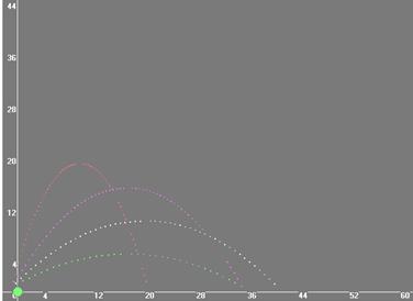 На рисунке №6 зеленым цветом изображен график снаряда выпущенного под углом 30°, белым под углом 45°, фиолетовым под углом 60°, а красным под углом 75°. А теперь посмотрим на графики полёта снарядов и сравним их.(начальная скорость одинакова, и равна 20 км/ч)