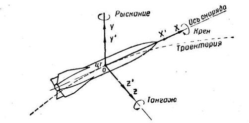 Изучение разнообразных и сложных движений, совершаемых ракетой может быть значительно упрощено, если движение ракеты представить как сумму поступательного движения её центра тяжести и вращательного движения относительно центра тяжести. Примеры, приведенные выше, наглядно показывают, что для обеспечения устойчивости движения ракеты чрезвычайно важно иметь её устойчивость относительно центра тяжести, т. е. угловую стабилизацию ракеты. Вращение ракеты относительно центра тяжести можно представить как сумму вращательных движений относительно трёх перпендикулярных осей, имеющих определённую ориентацию в пространстве. На рис.№7 изображена идеальная оперенная ракета, летящая по рассчитанной траектории. Начало систем координат, относительно которой мы будем стабилизировать ракету, поместим в центр тяжести ракеты. Ось X направим по касательной к траектории в сторону движения ракеты. Ось Y проведём в плоскости траектории перпендикулярно к оси X, а ось