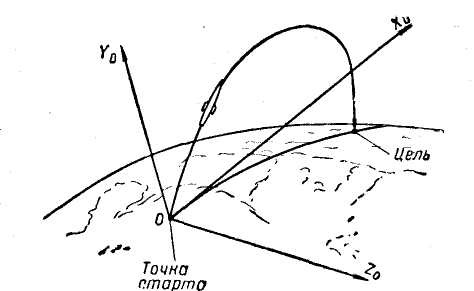 X , Y , Z её центра тяжести. За начало отсчёта берут точку старта ракеты. Для ракет дальнего действия за ось X принимают прямую, касательную к дуге большого круга, соединяющего старт с целью. Ось Y направляют при этом вверх, а ось Z - перпендикулярно к двум первым осям. Эта система координат называется земной (рис№9).