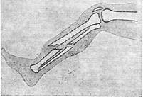 Сращение П. – сложный биологич. процесс, начинающийся спаянием отломков молодой соединительной тканью, образующей так наз. мягкую мозоль; последняя затем превращается в костную мозоль, прочно соединяющую отломки. Скорейшую сращению способствуют тесное соприкосновение отломков и покой. При этих условиях длительность сращения зависит от того, какая кость сломана. Быстрее всего (за 2-2,5 нед.) срастается П. фаланги пальца, дольше всего (за 6 мес.) – П. шейки бедренной кости. При большом расстоянии между отломками, вклинивании между ними слоя мягких тканей, при нарушениях покоя сращение П. замедляется и может вообще не произойти; в этом случае образуется ложный сустав. Сращение может наступить и при значительном смещении отломков, но тогда П. срастается неправильно, что приводит к укорочению или искривлению конечности (рис. 3.). Процесс сращения особенно нарушается при открытых П., подвергавшихся бактерийному загрязнению, в результате чего развивалась инфекция.