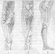 Рис. 2. Схематическое изображение смещения костных отломков при переломах в верхней ( 1 ), средней ( 2 ) и нижней ( 3 ) трети бедра.