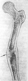 Рис. 3. Сращение отломков бедра под углом. Стрелкой указана костная мозоль.