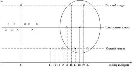 В контроле качества с успехом применяются контрольные карты. Контрольная карта состоит из центральной линии, двух контрольных пределов (над и под центральной линией) и значений характеристики (показателя качества), нанесенных на карту для представления состояния процесса. Контрольные карты служат для выявления определенной причины (не случайной).