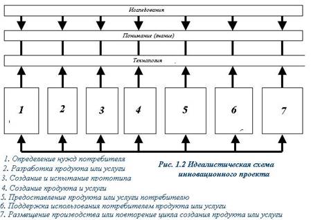 Среди многочисленных определений инновационного процесса (или тождественного с ним процесса коммерциализации технологий) наиболее распространен взгляд, по которому критическую роль играет интерактивное взаимодействие разработчиков технологии с окружающей средой. При этом модель развития инновации рассматривается как логически последовательная, хотя и не обязательно непрерывная, цепь событий, которая может быть разделена на серии функционально связанных и взаимно-зависимых стадий, соединяющих исполнителей инновационного проекта с более широким научно-технологическим сообществом и рынком.