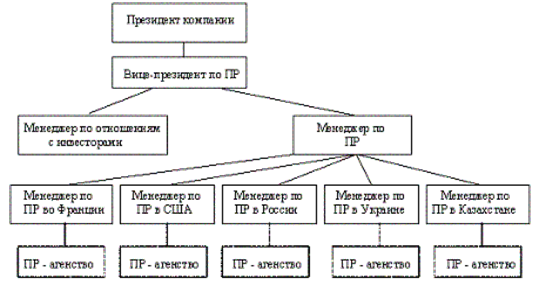 Место ПР-подразделения и его структура представлены на схеме, которая демонстрирует тот факт, что деятельность отдела по ПР и мнение его руководителя пользуется авторитетом в организации. Вице –президент по ПР входит в «доминантную коалицию» и участвует в процессе принятия решений. Однако это не совсем так. Данная схема была предложена ПР- агентством и одобрена президентом компании. Но, будучи достаточно авторитарной личностью, на практике президент не всегда «соглашается» с такой ролью отдела. Это подтверждают и приблизительный анализ деятельности ПР-подразделения, в которой 75-80% составляют «запрограммированные» решения и только 25-15% «непрограммируемые». Хотя президент компании и демонстрирует понимание важности деятельности отдела по ПР и готовность участвовать в его работе, в том числе и осуществляя рекомендуемое общение с внутренними членами организации и внешними партнерами и клиентами. Кроме того, он старается не забывать привлекать вице-президента по ПР к выработке стратегических решений и прислушиваться к его мнению.