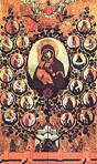 В центре иконы - образ Владимирской Божией Матери - святыни русских князей. Икона увита виноградной лозой, в ветвях которой Ушаков разместил образы русских святых, помогавших молитвой и личным участием мирному объединению русских земель.