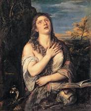 Многие прославленные художники изображали Марию Магдалину в тот момент, когда она, уединившись, с покаянной молитвой обращается к Богу. Такой предстаёт она перед нами на полотнах Эль Греко и Хусепе Риберы, Караваджо и Жоржа де ля Тура. Но наиболее совершенно идея очистительного и преображающего душу покаяния выражена, пожалуй, в картине Тициана, которая хранится в Санкт-Петербургском Эрмитаже. Удивительно верно передано художником то, как женское сердце переживает большое горе. Обращённые к небу глаза, полные слёз; покрасневшие от долгого неутешного плача веки; слёзы, обильно текущие по щекам; припухшие и, как и глаза, чуть покрасневшие и влажные ноздри и губы; рука, прижатая к груди, и другая, безвольно опущенная на колени, — всё это так живо, так убедительно передаёт всю глубину раскаяния Марии Магдалины, что внимательному и вдумчивому зрителю становится ясно: если человек столь горячо и сильно кается в своих прошлых проступках, в своём моральном падении, он уже никогда не повторит былых ошибок и не станет на дурную стезю. Он спасён. Ведь прошлое представляется Марии Магдалине страшной бедой, и все силы души её устремлены к тому, чтобы порвать с этим тёмным, греховным прошлым.
