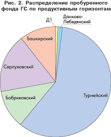 В Татарстане разработка залежей нефти с применением бурения ГС ведется на карбонатных отложениях, имеющих достаточно высокие значения толщин, башкирского, серпуховского, турнейского, заволжского, данково-лебедянского возрастов, и терригенных отложениях бобриковско-радаевского возраста. Рраспределение пробуренного фонда ГС (на 01.09.2003 г.) представлено на рис. 2.