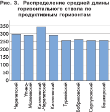 На рис. 3 представлено распределение средней длины ГС по продуктивным горизонтам. Средняя длина по всем 262 ГС составляет 257 м.