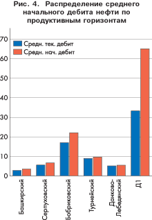 Общий средний текущий дебит нефти ГС превышает дебит нефти ВС в 1,4 раза. В т.ч. турнейские — в 1,3 раза, бобриковские — в 2,3 раза, данково-лебедянские — в 1,6 раза), в отличие от начального, когда превышение составляет 2 и более раз.