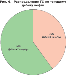 По распределению текущего дебита нефти видно, что более половины фонда ГС (60%) работают с дебитом нефти до 5 т/сут., 40% ГС работают с дебитом нефти больше 5 т/сут. (рис. 6).