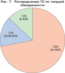 Из рис. 7 видно, что с обводненностью продукции до 20% работает почти 13% ГС, а с обводненностью продукции от 20% до 50% — 15% ГС и более 50% — 72% ГС.
