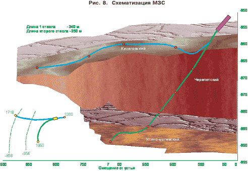 На рис. 8 приведен фактический профиль МЗС 8802 «РГ», пробуренный на кизеловский (1 ствол) и упино-малевский (2 ствол) отложения Ново-Елховского нефтяного месторождения.