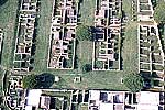 ДОМА-САДЫ были раскопаны вместе с остальной частью Остии в первой половине нынешнего столетия. Жилой комплекс, построенный примерно в 128 г., состоял из двух зданий, находившихся в прямоугольном дворе, окруженном сплошной застройкой. Фотографирование производилось сверху вдоль главной оси комплекса, идущей с востока на запад. На переднем плане видны главные (восточные) ворота. "Дом муз" в северо-восточной части комплекса был реставрирован.