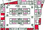 ПЛАН ПЕРВОГО ЭТАЖА домов-садов. Главная ось (восток – запад) и второстепенная ось (север – юг) пересекаются в центре комплекса. Здания, по-видимому, были четырехэтажными. Каждое из 17 жилищ на первом этаже состояло из нескольких комнат, окружавших центральное помещение, которое могло называться medianum (розовый). Комплекс включал также множество торговых помещений (красный).