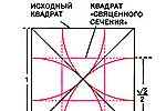 "СВЯЩЕННОЕ СЕЧЕНИЕ" исходного квадрата получается путем проведения дуг окружностей (с центрами в углах квадрата), проходящих через центр квадрата (вверху). Соединяя точки пересечения дуг со сторонами квадрата, можно получить сетку, делящую квадрат на девять частей; центральный квадрат называется квадратом "священного сечения". Длина каждой дуги AB равна, с точностью до 0,6 %, длине диагонали CD прямоугольника, составляющего половину исходного квадрата (в центре). Метод "священного сечения" позволяет приблизительно решить задачу спрямления окружности: периметр квадрата, образованного из четырех отрезков CD, примерно равен длине окружности, образованной из четырех дуг "священного сечения" (внизу).