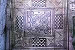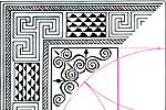 В наименьшем масштабе в домах-садах "священное сечение" определяет композиции мозаики пола, а также росписи стен и потолка. Ни одно из этих украшений в зданиях внутри двора не сохранилось достаточно хорошо, однако некоторые из них уцелели в зданиях по периметру. В доме, называвшемся "Домом муз", в северо-восточной части комплекса, квадратный пол одной из комнат почти полностью покрыт мозаикой. В центре мозаичного рисунка находится квадратный медальон; его размер определяется "священным сечением" квадрата, ограждающего внешнюю границу мозаики. Подобные рисунки обнаружены и в других частях домов-садов. В некоторых случаях мозаичные украшения в различных комнатах одного и того же жилища были, по-видимому, связаны между собой размерами и геометрией. Например, мозаика в одной комнате могла иметь размер квадрата "священного сечения" мозаики в большой комнате. Помимо мозаики пола большинство комнат в домах-садах имели ярко расписанные потолки и стены. Ни один из рисунков потолков не сохранился полностью, однако имеется достаточное число фрагментов одного из них, по которым можно восстановить его композицию. Как и мозаика пола, он был квадратным и находился в центре потолка. "Священные сечения" внешнего квадрата определяют положение двух систем дуг; квадрат "священного сечения" внешней границы делится вторично и определяет центральный медальон.