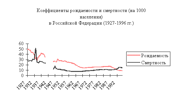 Если в 1990 г. отрицательное значение коэффициента естественного прироста было зафиксировано только для территорий Нечерноземной зоны России: Смоленской, Псковской, Новгородской, Ленинградской, Костромской, Владимирской, Ярославской, Ивановской, Тверской, Московской, Тульской, Рязанской, Калужской, Воронежской, Орловской, Тамбовской, Липецкой и Курской областей, гг. Москвы и Санкт-Петербурга и Краснодарского края, а для остальных территорий он оставался положительным- то в 1996 г. положительным коэффициент естественного прироста был только для 17 территорий: Республики Калмыкии, пяти северокавказских республик (Карачаево-Черкессии, Кабардино- Балкарии, Дагестана, Ингушетии и Чечни), активно развивающейся Тюменской области, Республик Саха и Тыва и для национальных округов, расположенных на севере, в Сибири и на Дальнем Востоке страны (Ненецкого, Ямало-Ненецкого, Таймырского, Эвенкийского, Ханты-Мансийского, Агинского Бурятского, Усть- Ордынского Бурятского и Чукотского).