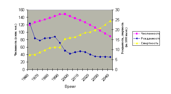 Понятно, что если на протяжении десятилетий рождаемость населения снижается, а смертность растет, перспектива сокращения численности населения (депопуляции) становится неизбежной. Достаточно посмотреть на рис. 1, чтобы сделать вывод о том, что на протяжении почти 40 последних лет в России смертность неуклонно возрастала, рождаемость не росла, а с середины 80-х годов также стала интенсивно снижаться. Это привело к тому, что с 1992 г. смертность стала устойчиво превышать рождаемость.
