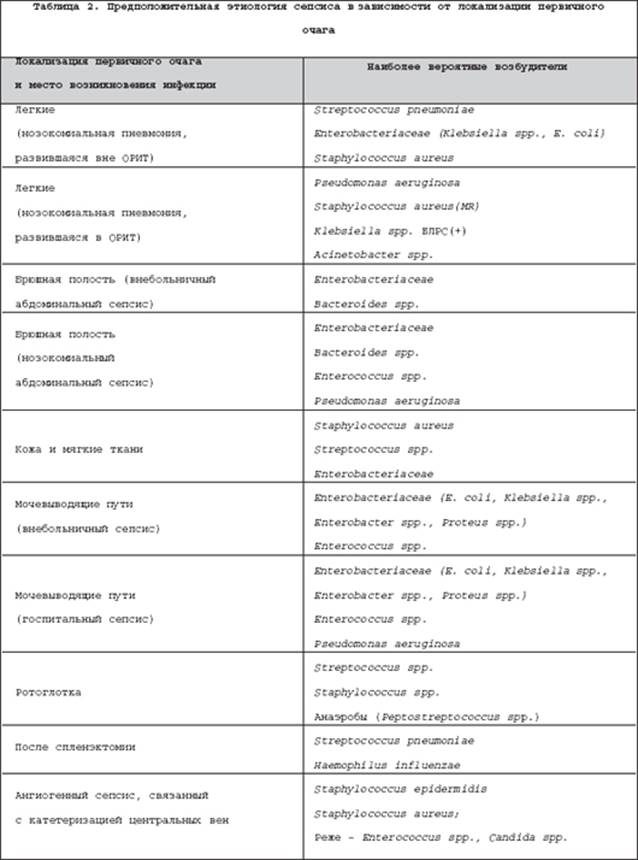 Взаимосвязь между локализацией очага инфекции и характером микрофлоры, запускающей инфекционно–воспалительный процесс, и местом его развития отображена в таблице 2. Обязательный ракурс оценки состояния пациента – наличие/отсутствие факторов риска смерти у пациента с сепсисом . Под фактором риска смерти понимают какую–либо клинико–лабораторную характеристику (особенность состояния пациента), являющуюся самостоятельным статистически значимым фактором, повышающим риск развития неблагоприятного исхода. В этом отношении наибольшее значение имеют: локализация инфекционного очага, шок и тяжесть ПОН, место возникновения сепсиса (госпитальный, внебольничный), особенности бактериемии (первичная, вторичная, род или вид возбудителя). Эти данные были получены как при рассмотрении когортных исследований, так и в результате выполнения post hoc анализа значительного объема контролируемых испытаний по оценке эффективности отдельных лекарственных средств при сепсисе. В частности, было доказано, что локализация инфекционного очага в брюшной полости и легких сопровождается более высокой смертностью, чем при его нахождении в мочевыводящих путях или коже и мягких тканях при идентичных значениях индексов тяжести состояния пациента [10].