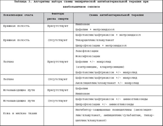 Кроме того, шансы на выживание снижаются у пожилых и престарелых больных, а также у лиц с декомпенсированной хронической сопутствующей патологией (ХПН, ХСН, ХОБЛ, сахарный диабет). В целом алгоритмы выбора схемы АБТ при сепсисе с обозначенных позиций представлены в таблицах 3–4. Подразделение АБТ в зависимости от риска развития неблагоприятного исхода при внебольничном сепсисе обусловлено стремлением максимального снижения вероятности ошибки по выбору препарата и более быстрой эрадикации возбудителя у пациентов в критическом состоянии. Помимо этого, в отношении обозначенных схем выбора в настоящее время имеется обширная клиническая практика, отдельные когортные и контролируемые исследования, свидетельствующие об их высокой эффективности при сепсисе. Вместе с тем, учитывая отчетливую тенденцию к росту устойчивости синегнойной палочки к карбапенемам, следует ограничивать их применение для терапии внебольничного сепсиса в отделениях с высоким уровнем распространенности ГИ и резистентности к ним данного микроорганизма. Анализ применения появившихся в последние годы в арсенале отечественных специалистов респираторных фторхинолонов (левофлоксацин, моксифлоксацин) продемонстрировал их преимущество в плане снижения относительного риска смерти по сравнению с цефалоспоринами 2–3–й генерации в комбинации с макролидами [16].