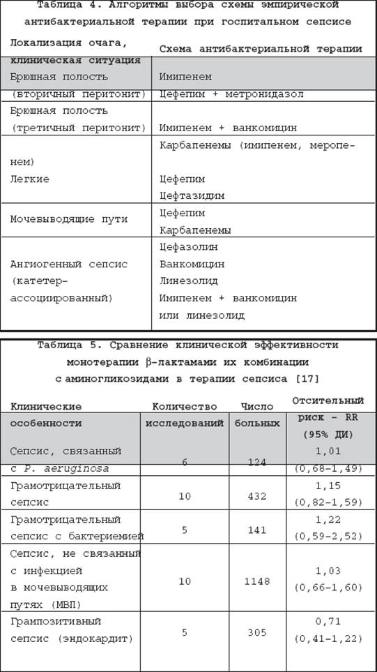 Логика ориентации на факторы риска смерти при выборе схемы АБТ не может в полной мере быть распространена на госпитальный сепсис в силу большей приоритетной значимости ситуации с локальным уровнем чувствительности ключевых возбудителей к АБП. Именно он должен определять выбор между препаратами разных групп или внутри одной из них. Из–за весьма существенного роста резистентности возбудителей ГИ круг потенциально эффективных препаратов в последние годы заметно сузился. Принимая во внимание результаты многоцентровых исследований в России, можно заключить, что наиболее надежная эмпирическая терапии госпитального сепсиса может быть связана с достаточно узким кругом препаратов – карбапенемами и цефепимом. Назначение ципрофлоксацина без знания особенностей по резистентности в конкретном отделении сопряжено с риском неудач. Добавление ванкомицина или линезолида будет оправданным при ангиогенном сепсисе (АС) или вентилятор–ассоциированной пневмонии (ВАП) в отделениях с высоким уровнем распространения MRSA или у пациентов с нейтропенией. На этиологическую структуру АС влияет несколько факторов: длительность катетеризации, место стояние катетера (верхняя полая или бедренная вена), проводимая АБТ, распространенность MRSA или MRSE в конкретном ОРИТ. При катетеризации более 10 суток и/или нахождении катетера в бедренной вене возрастает риск АС, связанного с P. aeruginosa, Enterococcus spp . и MRSA . Если эти факторы ассоциируют с тяжелым состоянием пациента (шок, ПОН), представляется обоснованной эмпирическая терапия в варианте имипенем (Тиенам) + ванкомицин или линезолид . Подчеркнем, что в результате субпопуляционного анализа установлена идентичная клиническая эффективность монотерапии ? –лактамами и их комбинации с аминогликозидами, в том числе и при сепсисе, связанном с P. aeruginosa (табл. 5) [17].