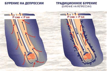 , наоборот, вызывает приток пластового флюида в скважину, сохраняя при этом естественные коллекторские свойства пород. Режим бурения на депрессии наиболее оптимален также для проведения геолого-геохимических исследований.