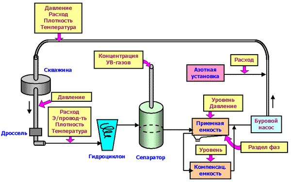 Рис. 2. Схема размещения датчиков в закрытой циркуляционной системе для вскрытия пластов на депрессии