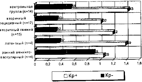 У 14 больных исследовались иммунологические показатели крови и ликвора. В группе больных вторичным рецидивным сифилисом (7 человек) отмечалось снижение уровня Т-хелперов, повышение уровня Т-супрессоров при нормальном общем количестве Т-лимфоцитов. Отмечено усиление сенсибилизации лимфоцитов к мозговому антигену (белку S-100), уровень иммуноглобулинов в крови (G. М, А) не отличался от показателей контрольной группы. Выявлено незначительное повышение уровня lgG ликвора при нормальном цитозе и положительной РИФ. У больных менинговаскулярным сифилисом (4 человека) отмечались те же закономерности, но изменения носили более выраженный характер. При цитологическом исследовании ликвора этих больных выявлены трансформированные лимфоциты. Значительных изменений иммунологических показателей в группе больных вторичным свежим сифилисом не выявлено.