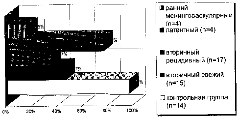 Обследовано 40 больных в возрасте 18-35 лет, проходивших лечение в клинике кожно-венерологических заболеваний СПбГМА. Из них 4 больных - с первичным скрытым сифилисом, 17-со вторичным рецидивным, 15-со вторичным свежим и 4 - с ранним менинговаскулярным сифилисом. Для контроля была обследована группа клинически здоровых людей -14 человек. В группу больных сифилисом не включались больные с сопутствующей патологией.