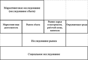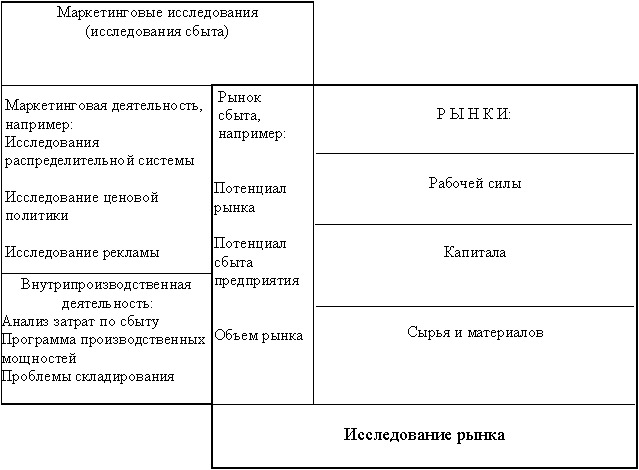 Понятие исследование сбыта или маркетинговое исследование уже, чем исследование рынка потому, что при их проведении беспокоятся только о рынках сбыта продукции предприятия. Тогда как исследование рынка касается также рынка производственных сил, то есть рынков рабочей силы, сырья и энергии, материалов, установок и агрегатов, денег и капитала.
