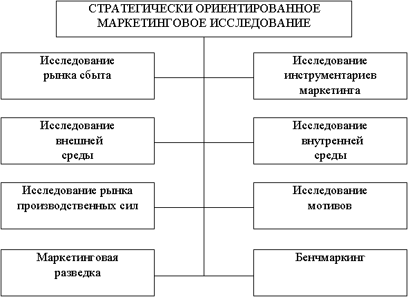 Таким образом стратегически ориентированное маркетинговое исследование представляет собой более широкое понятие, которое включает в себя исследование рынка сбыта, исследование внутренней среды фирмы, исследование маркетингового инструментария, его разработанность и эффективность использования, исследование рынка производительных сил (рабочая сила, сырье и материалы, денежный рынок и рынок капитала), исследование внешней среды, организацию исследований на основе бенчмаркинга и проведения маркетинговой разведки (рис.5.3.). Такое понятие сосредотачивает внимание маркетолога и предпринимателя на важнейших элементах сферы маркетингового исследования и заведомо облегчает формирование задач маркетинговых исследований, поиск "узких мест", "горящих точек", которые могут сопровождать процесс функционирования предприятия в условиях рынка, а также оказывать помощь в осуществлении контроля за организацией сбора и подготовки маркетинговой информации.