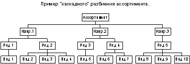 Оптимальным для определения групп продукта является комбинация “каскадного подхода” и матричного представления. При каскадном подходе (известным также под названием “сверху вниз”) весь ассортимент последовательно делиться по схожести удовлетворяемых потребностей на иерархические уровни с любыми удобными названиями (направления, типы, виды, группы, подгруппы и т.п.) до желаемой глубины проникновения (вплоть до каждого продукта).