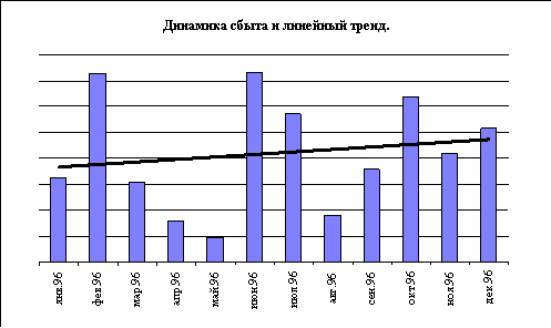 Линейный тренд (тенденция) по сути и призван дать ответ о направлении движения предприятия в течение базового периода. В математическом смысле тренд представляет собой линейную функцию, восстановленную по ее дискретным фактическим значениям с минимизацией отклонений фактических значений (как правило, с использованием метода наименьших квадратов). В приложении к функции сбыта линейный тренд представляет собой тенденцию ее развития в наиболее общем, абстрагированном от случайных колебаний виде. Ниже представлен линейный тренд, вычисленный по стандартной процедуре для тех же фактических значений помесячных объемов сбыта. Отчетливо видно, что в целом, в течение года, объемы сбыта проявляют тенденцию к некоторому росту.