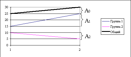 , т.е. единичное приращение суммарного сбыта состоит из единичных приращений (с обоими знаками) сбыта всех групп продукта, включенных в ассортимент предприятия, что и проиллюстрировано ниже на примере, где общий объем сбыта состоит из двух групп. Наглядно видно, что суммарное приращение сбыта A0